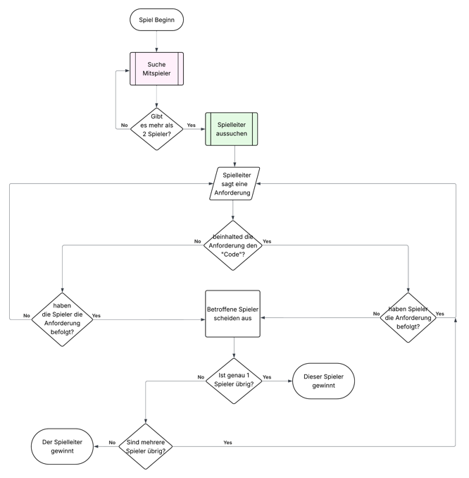 In dieser Aufgabe wurde ein Kinderspiel zugewiesen, dessen Ablauf ausschließlich mithilfe eines Flowcharts dargestellt werden sollte, ohne das Spiel direkt zu benennen. In meinem Fall handelte es sich um „Simon Says“, was eine besondere Herausforderung darstellte. Durch mehrere Überarbeitungen und Feedbackrunden versuchte ich, den Spielablauf möglichst eindeutig und verständlich darzustellen. Eine klare Strukturierung durch Abstände, Pfeilführung und farbliche Zuweisungen half dabei, Entscheidungen und Abläufe nachvollziehbar zu machen.